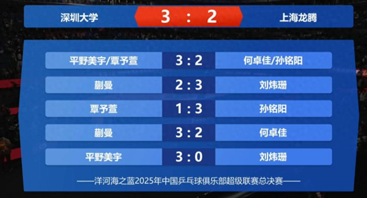 这场因 “双星缺席” 充满悬念的较量,最终以深圳大学 3-2 的惊险比分落幕,日本外援平野美宇独揽双打、单打两胜成绝对功臣,而国乒新生代主力蒯曼则交出 1 胜 1 负的 “过山车” 答卷,险些让球队遭遇冷门,全程五盘对决的跌宕起伏,堪称本届乒超最具戏剧性的战役之一。