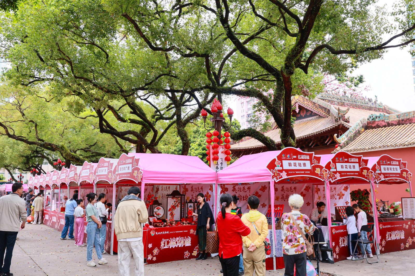 今年红棉潮墟以百年农讲所为主场,现场布置深度融合农讲所地标及文化属性,以红墙、木棉树、大闸门、广州少儿图书馆(20世纪六七十年代是农讲所旧址陈列馆)等元素,打造网红打卡装置,构建“文化+旅游+商业”三位一体的沉浸式体验空间。潮墟不仅是文创市集,更是红色文化的生活化表达,当市民游客在红墙下拍照打卡、在木棉树下驻足停留,红色基因便在不经意间融入日常。